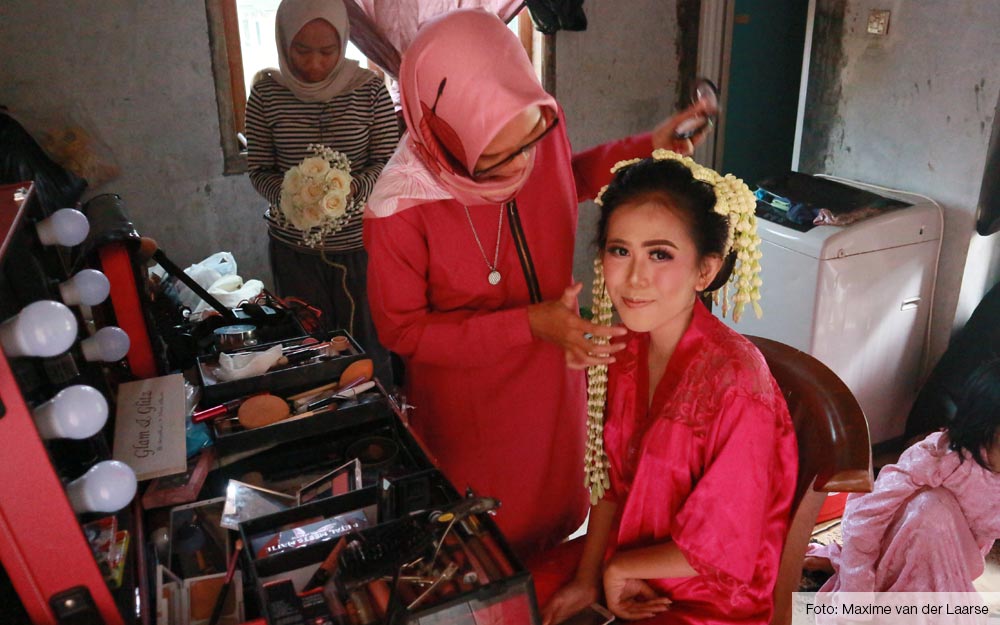 'Ik heb alles zelf bedacht, met behulp van Pinterest. Het is deels traditioneel, deels Westers,' vertelt Frizka. Uniek is het in ieder geval. De dag begint in alle vroegte met douchen, make-up, omkleden en ontbijten. Want de bruiloft duurt van 8 tot 5 uur.