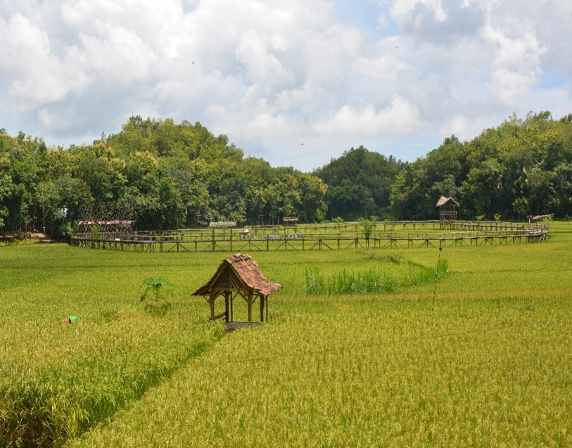 Ons volgende bezoek is aan ‘Songgo Langit’ een rijstveld op stelten. In 2016 brachten studenten van de Universitas Muhammadiyah Yogyakarta (UMY) een studiebezoek aan het dorp Mangunan. Ze raakten daar in gesprek met Pak Widodo, het dorpshoofd. Hij vertelde dat er in zijn directe omgeving allerlei toeristische initiatieven waren genomen voor buitenlandse en lokale bezoekers. “Ons dorp wil ook graag iets doen. Kunnen jullie ons adviseren?” zo vroeg hij de studenten. En zo ontstond het concept van ‘Songgo Langit’, een rijstveld op stelten. In het rijstveld dat de bewoners van Desa Mangunan gezamenlijk beheren is een ronde loopbrug aangelegd van 360 meter. De brug is gemaakt van bamboe en staat 1.5 meter boven het maaiveld. Bezoekers kunnen al lopende over de brug boven op de geplante rijst kijken. De brug door de bewoners van Mangunan zelf aangelegd met gebruik van bamboe dat in hun dorp groeit, trekt sinds haar opening veel bezoekers. Vooral in weekend is het er druk.