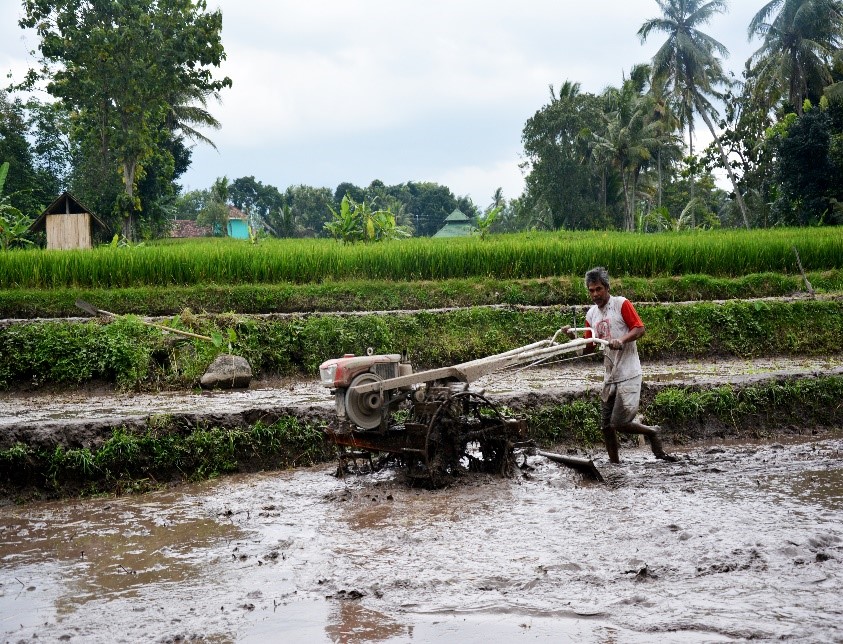 Terwijl tot aan Cikampek nog sprake is van veel lintbebouwing aan de kant van de tolweg, valt deze daarna weg. We rijden door een prachtig gebied van rijstvelden en restanten van vroegere plantages. Het is het einde van het regenseizoen en de gerijpte rijst staat klaar om geoogst te worden. Op sommige plaatsen is dat al gebeurd en staan jonge rijstplantjes al klaar voor de volgende oogst. Dat laatste hangt af of er al of niet een irrigatiesysteem in het gebied aanwezig is. Deze maakt tweede of soms ook derde oogst mogelijk. Is een gebied slechts afhankelijk van regenval dan kan er meestal niet meer dan een enkele oogst per jaar zijn.