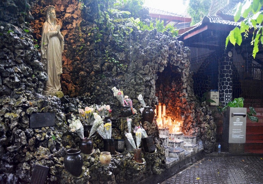 We parkeren onze auto op een klein plateau dat omgeven is met spandoeken van katholieke scholen die ‘Gua Maria’ eerder hebben bezocht. Een smal pad brengt ons naar de plek waar in 1904 Pastoor Van Lith 171 mensen tot het Katholieke geloof bekeerde. 25 jaar later werd de plek officieel ingezegend.