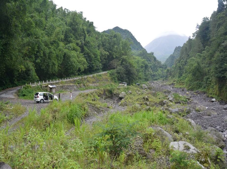 Na de lunch rijden langs een smalle weg naar Turgo op de helling van de Merapi. De eerste tien kilometers zijn nog druk bewoond. Dan wordt het een stuk minder. Wel zien we onderweg veel boomgaarden met salak vruchten. We hebben geluk. De 2,914 meter hoge Merapi is duidelijk te zien. Boven haar top hangt een witgrijze wolk. We rijden verder en zien borden met ‘Jalan Evakuasi’, die aangeven hoe je in geval van een hevige eruptie moet wegvluchten.