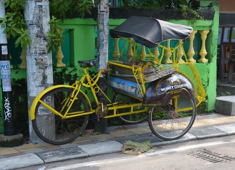 Tegen vijf uur komen we in ons hotel in Prawirotama aan. Flora en ik gaan naar Via Via waar een klein jazz trio de gasten onderhoudt. Een oude becakman brengt ons terug naar het hotel. Hij is een van de laatste becak rijders in Jogjakarta. Het is een uitstervend beroep dat jonge mensen niet meer willen uitoefenen. Die worden liever Gojek rijder op een motorfiets die je via je Smartphone kan oproepen. We geven de oude man een ruime fooi waarvoor hij onze handen schuddend bedankt.