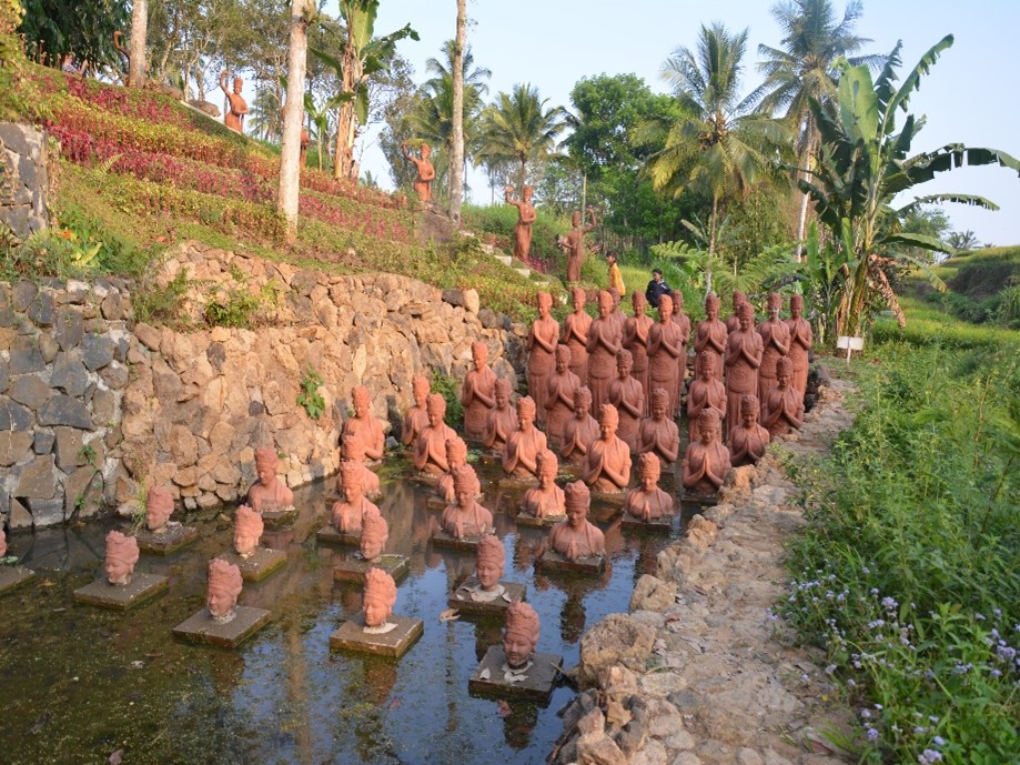 We rijden verder naar beneden en komen terecht in het bewoonde deel van de Ijen helling. Het is een vruchtbaar groengebied met rijstvelden en kleine plantages met koffie, kruidnagels en rubber. We stoppen bij een recent geopende attractie, ‘Taman Gandrung Terakota’, de Gandrung Keramische Tuin. De tuin is gewijd aan de Gandrung danseres van Banyuwangi en aangelegd door kunstenaars in Banyuwangi die willen dat de unieke danskunst van Banyuwangi binnen haar gebied maar ook daarbuiten meer bekendheid krijgt. De tuin ligt naast het luxueuze Ijen Resort.