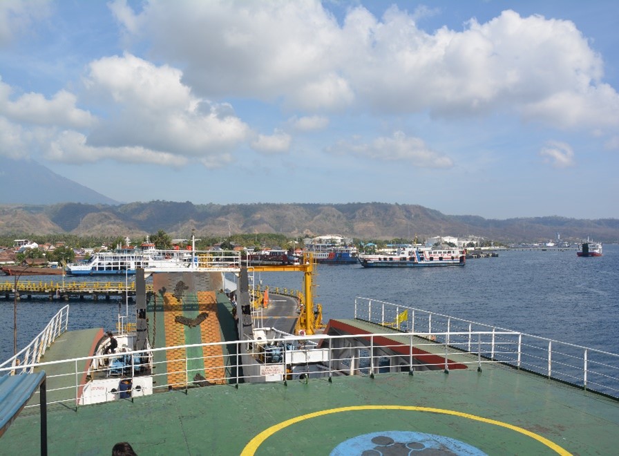 Twee uur later zijn we weer op de grote weg naar Gilimanuk van waar de veerboten oversteken naar Java. Als we Google controleren zien dat het weggedeelte waar de vrachtwagen het heeft begeven nog steeds vast zit. Dat verklaart ook waarom we met een bijna lege veerboot de Bali Straat oversteken. We verblijven ook deze keer in het Ketapang Hotel met zijn prachtige inrichting en locatie aan de Bali Straat.