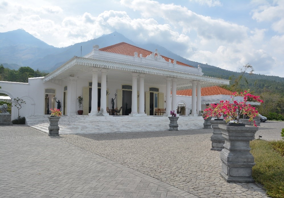Pas in de buurt van Probolinggo is er de afslag richting Malang. Eerst langs een smalle dorpsweg dan via de pas klaargekomen tolweg. We rijden deze uit tot het plaatsje Pandaan. Daar slaan we rechtsaf een weg in die naar de helling van Arjuna Berg leidt. Na een half uur we zijn dan op 800 meter hoogte rijden we de brede toegangsweg naar Kaliandra in. Ofschoon we de Website gezien hebben van het Resort overtreft de realiteit onze verwachtingen. Het hoofdgebouw de ‘Roemah Kolonial’, het Koloniale Huis, is groter dan we gedacht hebben. Met grote pilaren aan de voorkant, een rood pannendak en verder alles in het wit geeft het huis een schitterende aanblik. Vanuit het voorportaal hebben we een prachtig uitzicht op de laagvlakte van Java.