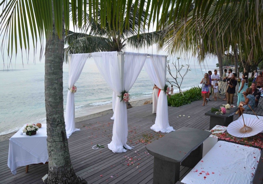 Aan het einde van de dag brengen we een bezoek aan Hotel Qunci. We zien veel mensen bij de pool in afwachting van ‘Happy Hour’ en zonsondergang. De hotelgasten zijn afkomstig uit Europa, India en ook zijn er twee Arabische echtparen. Op korte afstand van hen liggen twee westerse vrouwen in bikini te zonnen. Aan de rechterkant van het zwembad heeft net een trouw plechtigheid plaatsgevonden in een witte tent vlak aan het strand. Het pad naar de tent ligt vol met witte en rode bloemblaadjes. Even later zie ik het bruidspaar. Het zijn Luna en Leon afkomstig uit Italie. Het lijkt er op dat ze al langere tijd met elkaar hebben samengewoond, want later aan het kleurig opgesierde banket zit aan het hoofd van de tafel hun tweejarige zoon.