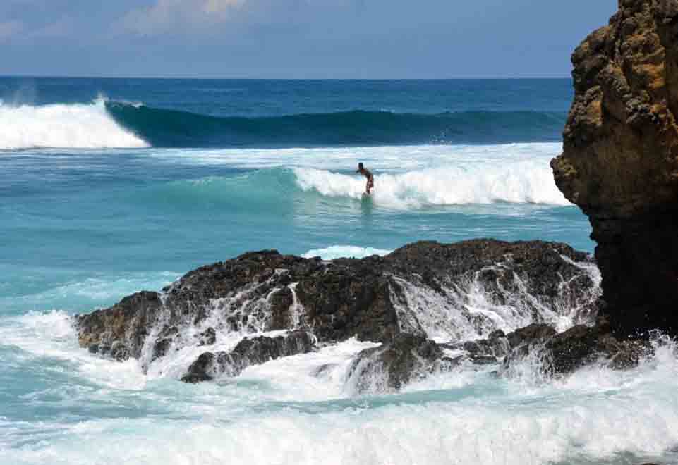 Het is niet druk op het strand. De meeste hotelgangers blijven binnen het hotel terrein. Alleen bij de openbare stukken zien we wat jonge backpackers zitten bij een lokaal tentje dat bier en eenvoudig Indonesisch eten serveert en waar je surfplanken kan huren. Het tentje wordt beheerd door lokale mensen, die eerder hun land aan de grote hotelketens hebben verkocht en nu een marginaal bestaan leiden tussen deze ketens.