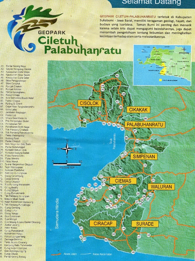 Van Tante Nora hebben we een kaartje van Geopark Ciletuh Pelabuhan Ratu gekregen. We willen graag met de auto het achterland van Cisolok in. Het kaartje laat zien dat we vanuit Cisolok langs Cipanas naar boven kunnen rijden. Bij de afslag naar Cikotok moeten we dan naar rechts gaan, vervolgens eerst naar het oosten te rijden en een weg naar het zuiden te nemen die bij Cimaja uitkomt.