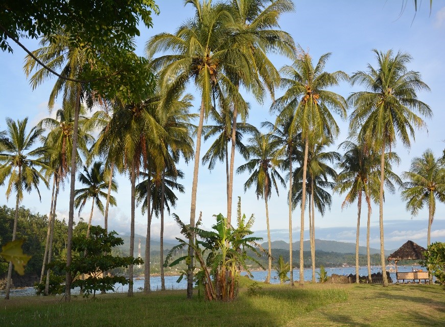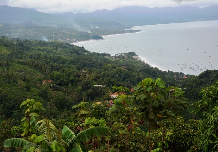 Als we naar beneden kijken zien we onderaan de helling van Puncak Habibie een strand met vissersboten. Vanuit de warung kunnen we echter niet zien hoe je er komt. “Ik breng jullie wel naar de toegangsweg”, zegt de warung buurman. “Ik heb toch spijkers nodig en de zaak waar ik die koop is daar in de buurt.”