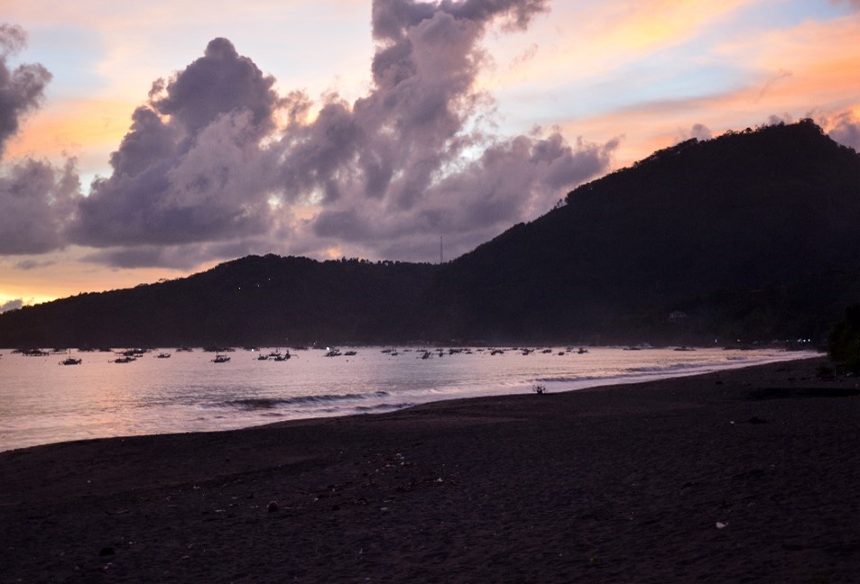 De zon gaat onder. We gaan gauw naar het strand om de zonsondergang te fotograferen. We hebben geluk. De ondergaande zon, het donker wordende oceaanwater en de schaduw van de Bukit Habibie heuvel maken een prachtig plaatje. Intussen zien we dat voor de kust drijvende vissersvlotten hun lichten hebben aangestoken. De lichten moeten nieuwsgierige vissen naar hun netten lokken. De tientallen vlotten zien er uit als een drijvende stad. Tot voor kort werden er olielampen als verlichting gebruikt. Nu zijn het de nieuwe energiezuinige lampen met autoaccu’s.
