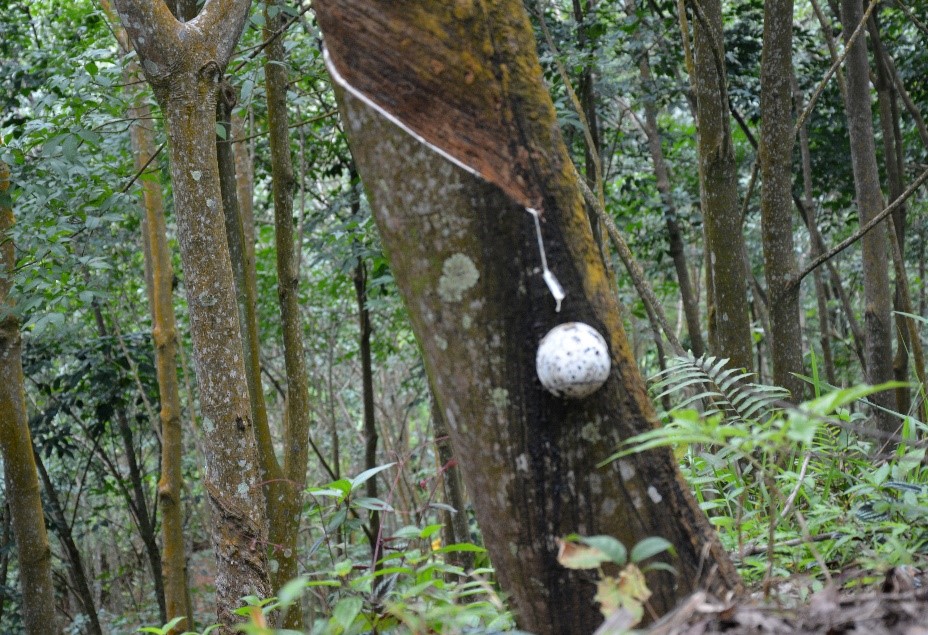 We passeren links Cipanas en rijden even later langs een oude rubberplantage. Uit de kommetjes onderaan de boom zien we dat de latex rubbermelk hier nog steeds getapt wordt. Hoewel natuurrubber al lang vervangen is door synthetisch rubber, heeft natuurrubber door haar superieure eigenschappen nog steeds vele toepassingen.