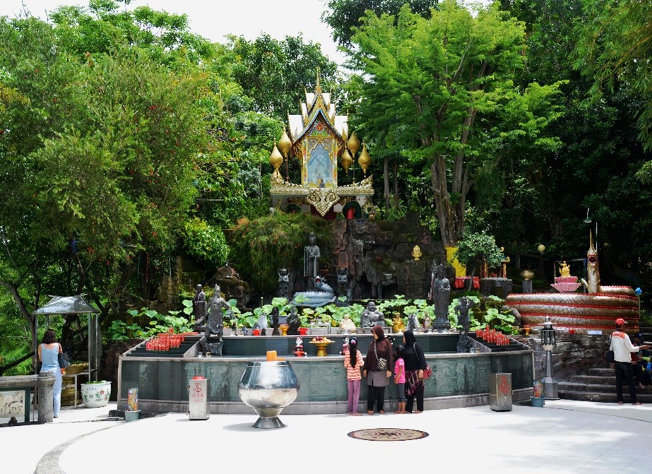 Alleen de bovenste tempel gewijd aan de Vier Gezichten van Boeddha schept wat duidelijkheid. Daar staat een goudkleurig Boeddha beeld waarvan elk van de vier gezichten een verschillende zegen uitstraalt. Het eerste gezicht betreft: ‘Gezondheid, het tweede een Gunstige Lotsbeschikking, de derde het Hebben van Geluk in het algemeen en het vierde Geborgenheid’.