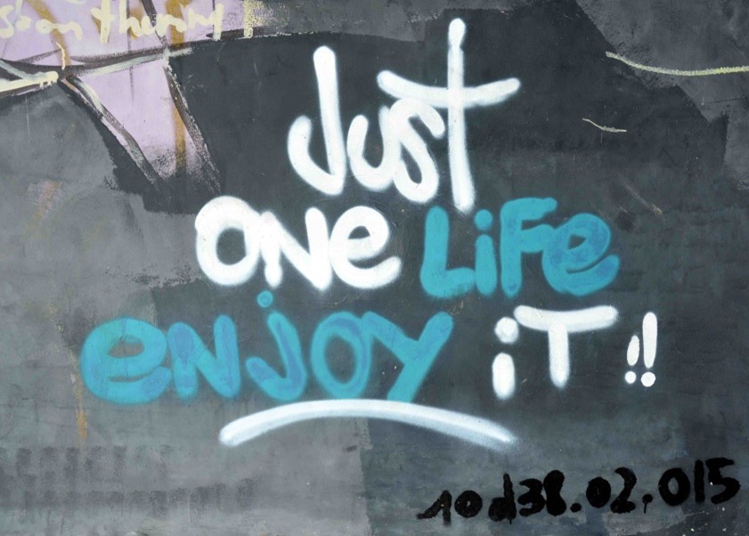 In Cimaja rijden we langs een smalle weg naar het surfstrand waaraan de Cimaja Beach Club gelegen is. We stoppen bij het strand en lopen vervolgens via een pad met kiezelstenen naar de Club. Een oudere man herkent ons nog van ons laatste bezoek. Hij wilde ons toen een stuk land verkopen. Bij het surfstrand van kiezelstenen zijn hokjes gemaakt voor de surfers. Een graffiti artiest heeft op de muur van een van de hokjes een toepasselijk tafereel geschilderd met daarop de tekst: ‘Just One Life, Enjoy It’.